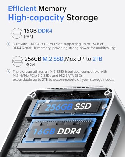 - HUGE STORAGE – 16GB RAM and 256GB SSD ensure seamless multitasking in a mini computer, quick launch of applications and sufficient space for files, videos or games. If you want more storage space, you can purchase an additional M.2 NVMe or SATA SSD with a larger storage capacity to replace our original 256GB SSD, which supports a maximum hard disk capacity of 2TB.