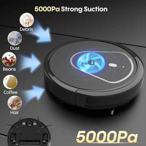 - 【5000Pa Super Strong Suction】Equipped with 5000Pa suction, this robot vacuum provides high-efficiency cleaning, effortlessly removing debris, pet hair, and ground-in dust. Its dual side brushes actively sweep debris from corners and edges into the suction path for comprehensive cleaning.